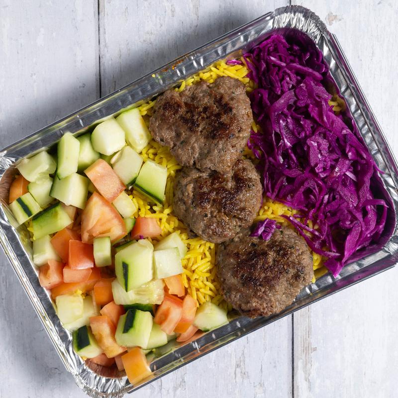 Grilled ground seasoned beef (KOFTA) over basmati rice, and Mediterranean pickles, served with a side of homemade hummus and salad.