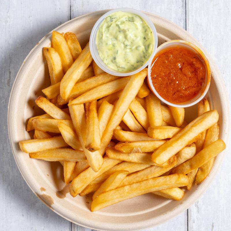 French fries topped with grilled kofta kebab, feta cheese, tzatziki, parsley, tomato, cucumber, pickle, drizzled with harissa and tahini sauce.