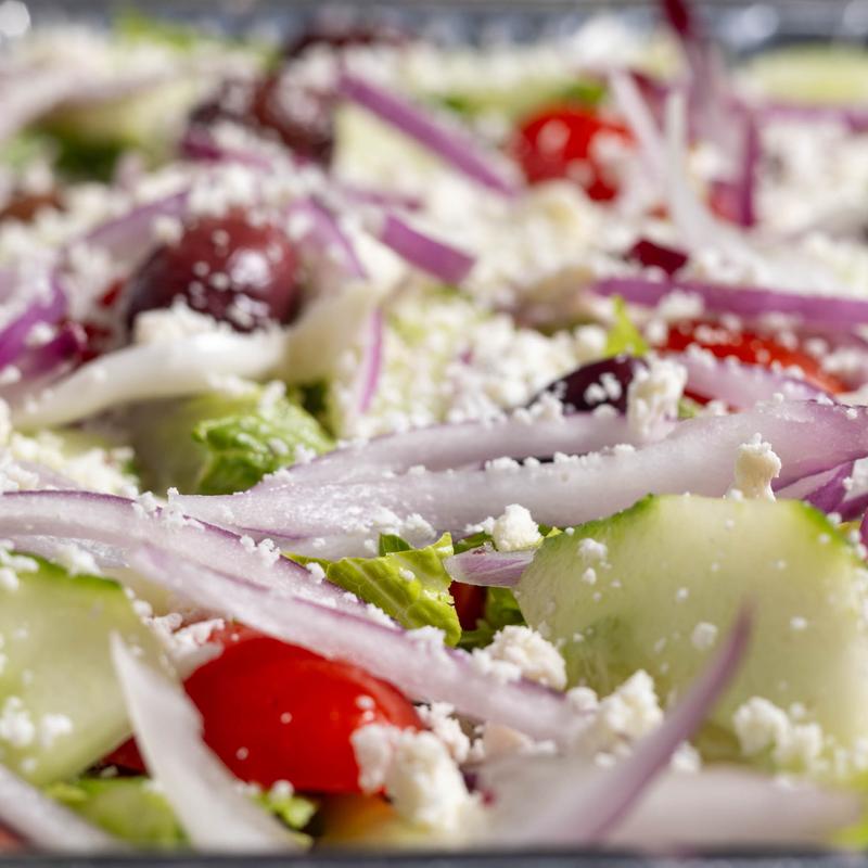 Romain lettuce, English cucumber, cherry tomatoes, red onions, kalamata olives, feta cheese, and Greek dressing.