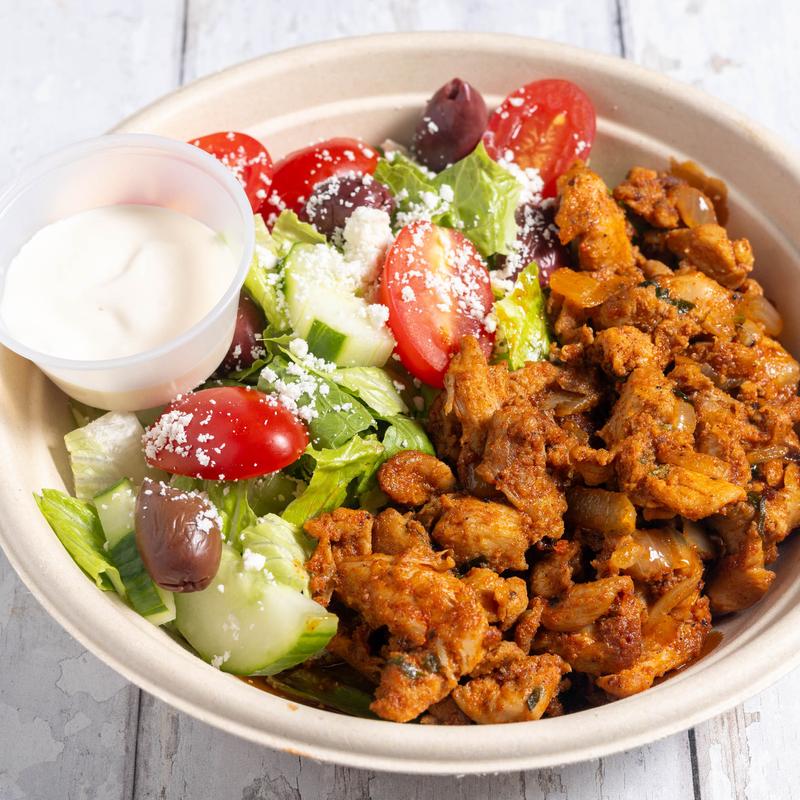 Juicy grilled chicken marinated in aromatic shawarma spices, served atop a crisp Greek salad. Topped with tangy Mediterranean pickles, rich Kalamata olives, creamy feta cheese, and finished with a drizzle of smooth tahini sauce and zesty Greek dressing. A vibrant fusion of bold Mediterranean flavors!