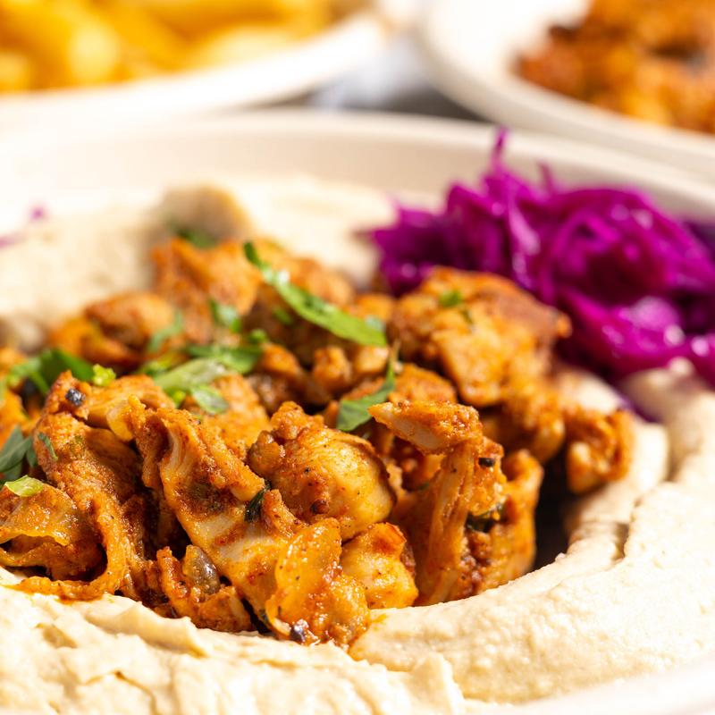 Marinated shawarma spiced chicken served with pickles and Moroccan salad over homemade hummus and pita.