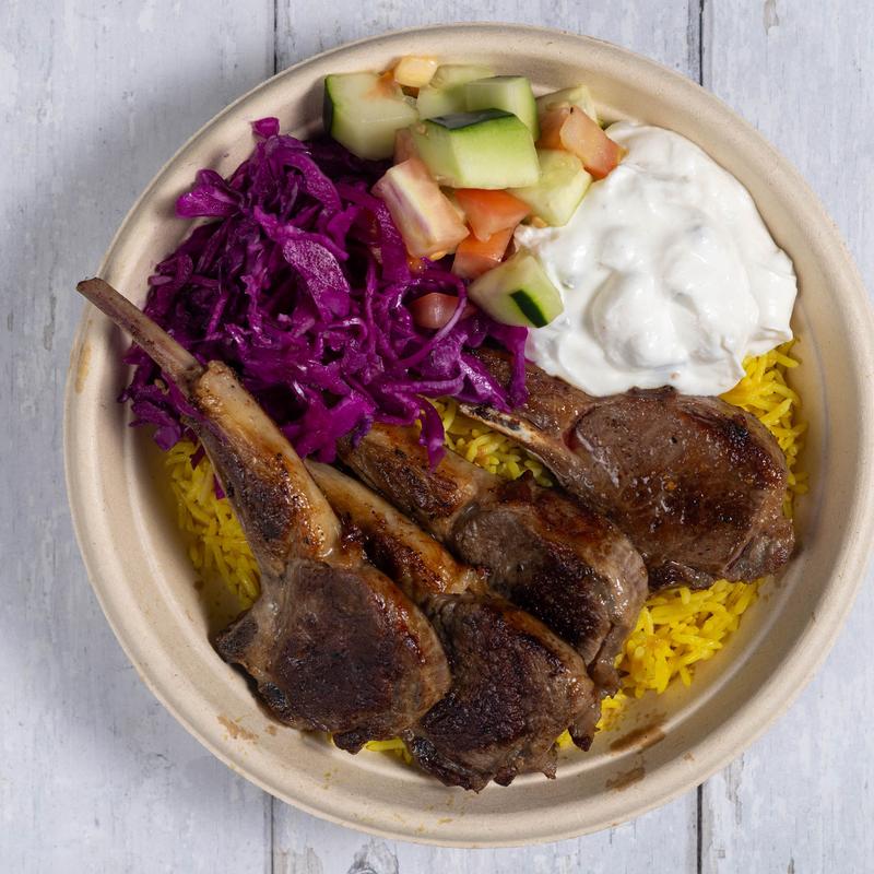 Enjoy three tender, grilled lamb chops served over fragrant basmati rice, topped with tangy pickles and creamy tzatziki sauce. Served with smooth hummus and a refreshing cucumber salad for a perfect balance of flavors.