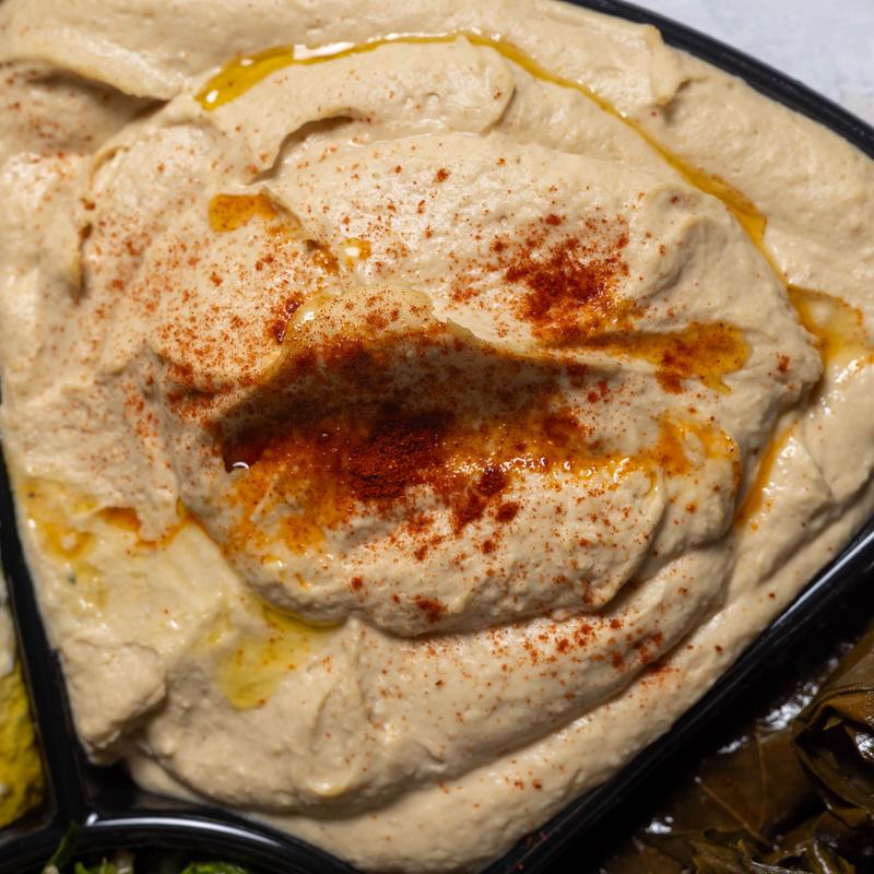 Homemade hummus, fresh chickpeas with garlic, tahini, fresh lemon juice, and extra virgin olive oil, topped with mixed spice.